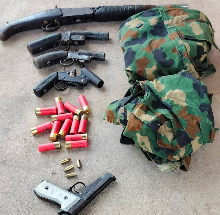 “During the raid, a fabricated Semi-Automatic Beretta Pistol with four (4) rounds of live ammunition, four locally made cut-to-size guns, thirteen (13) rounds of live cartridges, and a pair of military uniforms concealed in a black polythene bag were recovered”, he said.