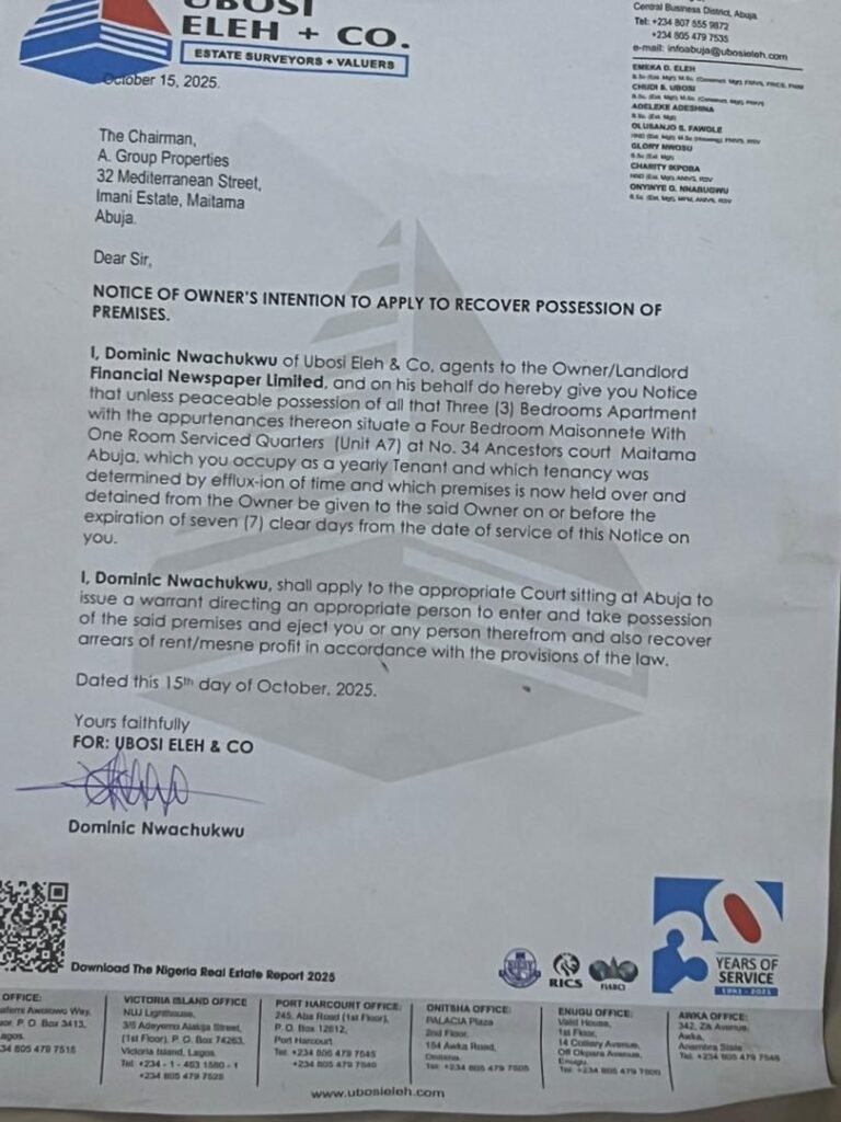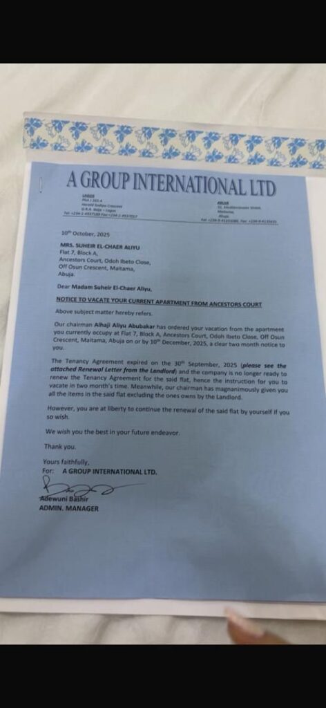 The letter, issued by A Group International Ltd, one of Aliyu Abubakar’s companies, read in part: “Our chairman, Alhaji Aliyu Abubakar, has ordered your vacation from the apartment you currently occupy… The company is no longer ready to renew the Tenancy Agreement for the said flat, hence the instruction for you to vacate in two months’ time.”