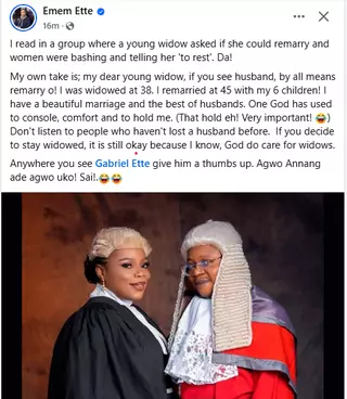 "I read in a group where a young widow asked if she could remarry and women were bashing and telling her 'to rest'. Da! My own take is; my dear young widow, if you see husband, by all means remarry o! I was widowed at 38. I remarried at 45 with my 6 children! I have a beautiful marriage and the best of husbands. One God has used to console, comfort and to hold me. (That hold eh! Very important!) Don't listen to people who haven't lost a husband before. If you decide to stay widowed, it is still okay because I know, God do care for widows. Anywhere you seeGabriel Ettegive him a thumbs up. Agwo Annang ade agwo uko! Sai!," she wrote.