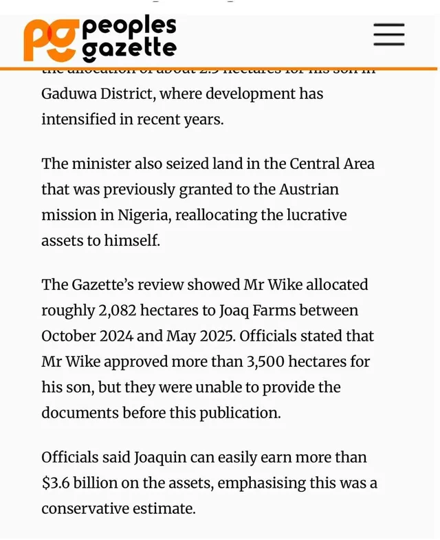 While it was unclear when the scheme was devised, documents showed Mr Wike started allocating the lands to Joaquin days after a company named after him was registered in October 2024.