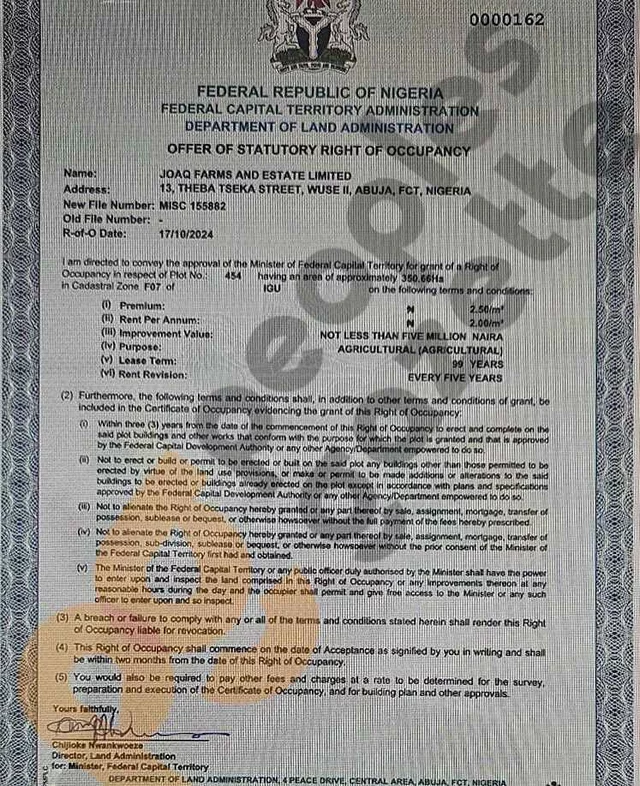 The company, Joaq Farms and Estates Ltd, was registered on October 10, 2024. Barely a week later, on October 17, 2024, Mr Wike allocated 350 hectares to the business via file number 155882 and certificate of occupancy number 0000162.