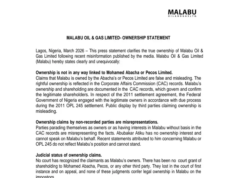 Malabu Oil & Gas Limited has debunked claims circulating in the media regarding its ownership structure, stating categorically that claims linking Malabu to the Abacha family or Pecos Limited are false and misleading.