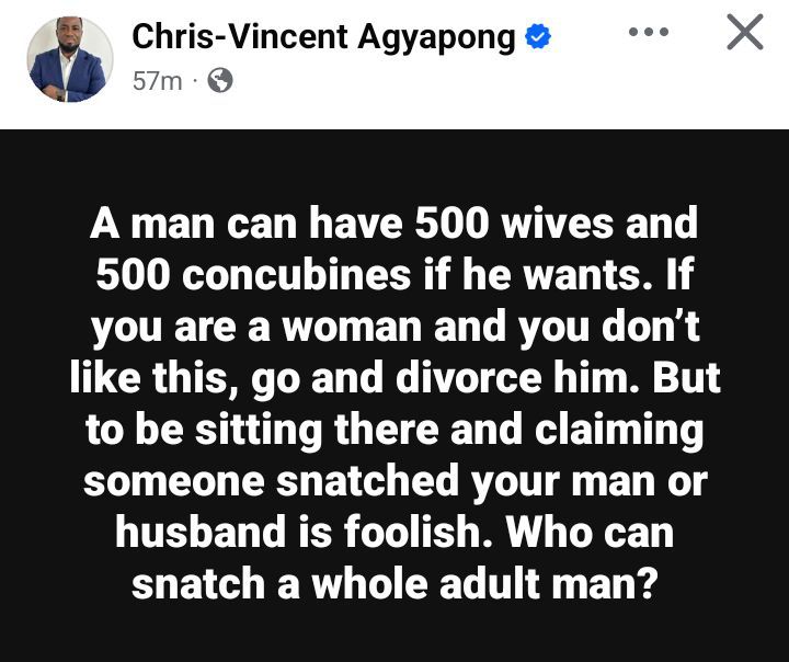 A Ghanaian lecturer, Chris-Vincent Agyapong, has addressed women, saying that a man is entitled to as many wives and concubines as he wants.
