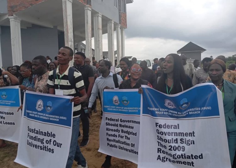 Lecturers in the Bayelsa State owned Niger Delta University, Ammassoma have staged a peaceful protest around the university campus against the recently introduced Federal Government Tertiary Institution Staff Support Fund loan scheme.