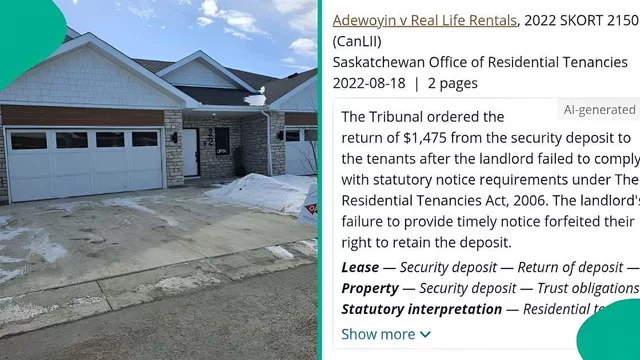 “Adewoyin v Real Life Rentals, 2022 SKORT 2150 (CanLII) The Tribunal ordered the return of $1,475 from the security deposit to the tenants after the landlord failed to comply with statutory notice requirements under The Residential Tenancies Act, 2006. The landlord’s failure to provide timely notice forfeited their right to retain the deposit.”