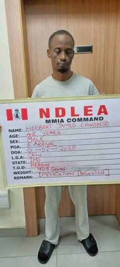The second kingpin, James Herbert Chinoso, 48, was arrested by NDLEA operatives at the Lagos airport on Saturday 1st February upon his arrival from Madagascar via Addis Ababa, Ethiopia on an Ethiopian Airlines flight. After a body scan confirmed illicit drug in his system, he was placed under excretion observation during which he egested 63 wraps of heroin with a total weight of 909 grams.