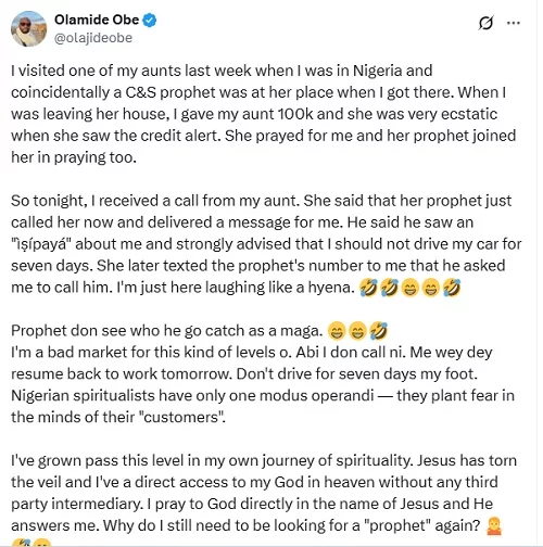 So tonight, I received a call from my aunt. She said that her prophet just called her now and delivered a message for me. He said he saw an “ìṣípayá” about me and strongly advised that I should not drive my car for seven days. She later texted the prophet’s number to me that he asked me to call him. I’m just here laughing like a hyena.