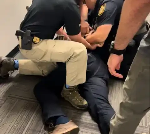 Video of the incident shows the senator struggling with multiple Secret Service agents before being shoved out of the room and dragged away, before uniformed FBI agents placed him on the ground and arrested him.