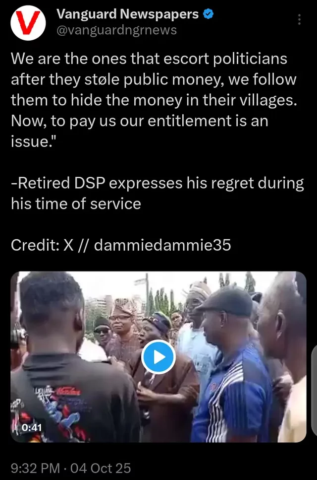 A video that was posted on the official X account of VANGUARD on Saturday, October 4, 2025 has captured the moment a retired DSP was saying that when he was in service, he usually escorts some politicians to hide stolen public funds in their villages.